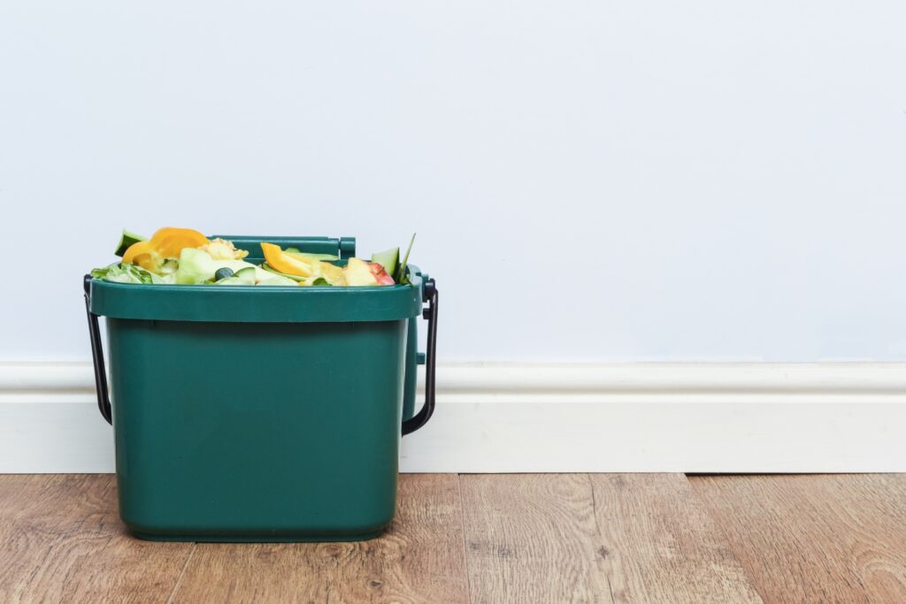 - Keep a sealed compost bin in your kitchen for fruit peels, veggie scraps, coffee grounds, and eggshells.